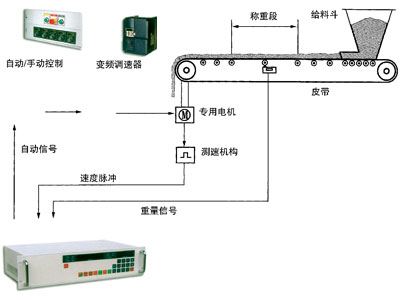 來自皮帶上物料的重量信號和皮帶運行的速度信號被一同傳到HL500B(一機一路DCS接口)或PL3000(一機十六路)測量和控制系統中(HL500B和PL3000內部均以微處理為核心)。通過連續不斷的比較設定值與皮帶實際輸送的物料重量,不停的調節皮帶運行的速度。因此,使用物料流量總能穩定在設定值上。